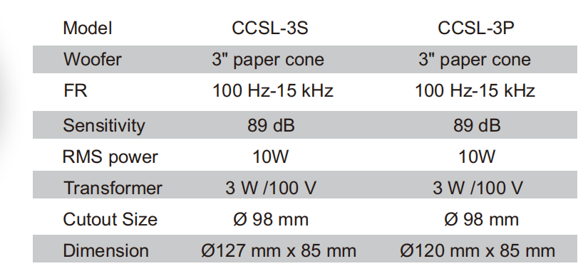 With 3W transformer support on 100V line systems, the CCSL-3S and CCSL-3P models are ideal for small venues like hotel corridors, restrooms, convenience stores, or utility zones. Despite its size, this model maintains consistent sound quality and reliability across daily-use environments.