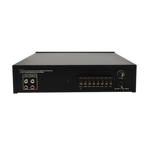This model combines multi-speaker compatibility with modern playback options, ensuring clear audio delivery for both announcements and music. Its compact, durable design is perfect for fixed installation in public facilities.